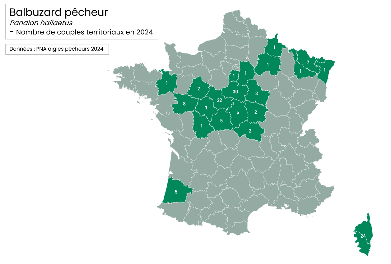 Les principaux bastions du Balbuzard pêcheur sont situés en région Centre-Val de Loire, dans le Grand Est, et sur la côte ouest de la Corse jusqu’au Cap Corse. Une population en cours de formation est présente dans les Landes grâce à un ambitieux programme de translocation.