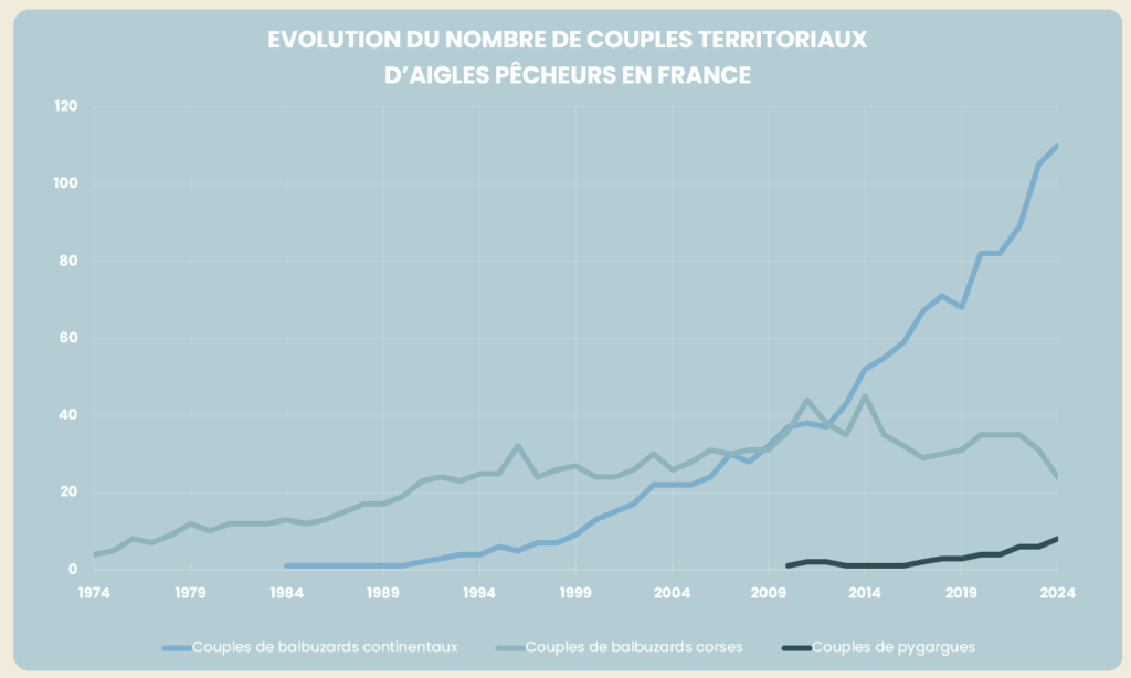Alors que la population continentale de Balbuzards pêcheurs est en croissance, avec plus de 110 couples territoriaux en 2024, la population corse est en difficulté avec plus que 24 couples territoriaux en 2024 et un succès reproducteur faible. L’espèce est classée vulnérable sur la Liste rouge de l’UICN des espèces menacées de France métropolitaine.