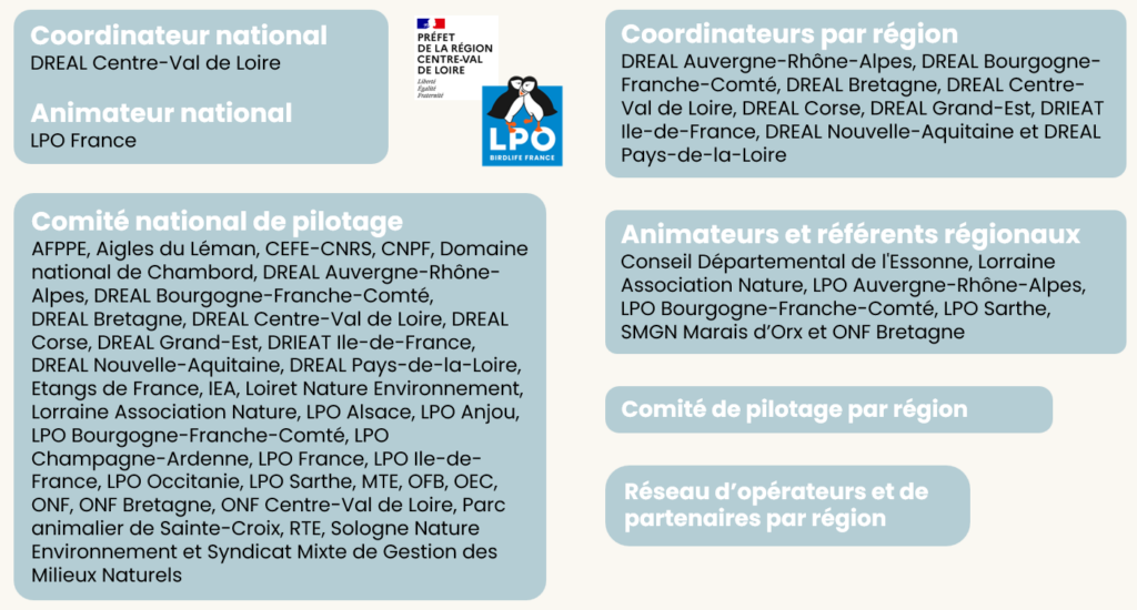 Le PNA Aigles Pêcheurs est coordonné par la DREAL Centre-Val de Loire et animé par la LPO France. Il s’appuie pour sa mise en œuvre sur un réseau de partenaires et fait l’objet de déclinaisons régionales.